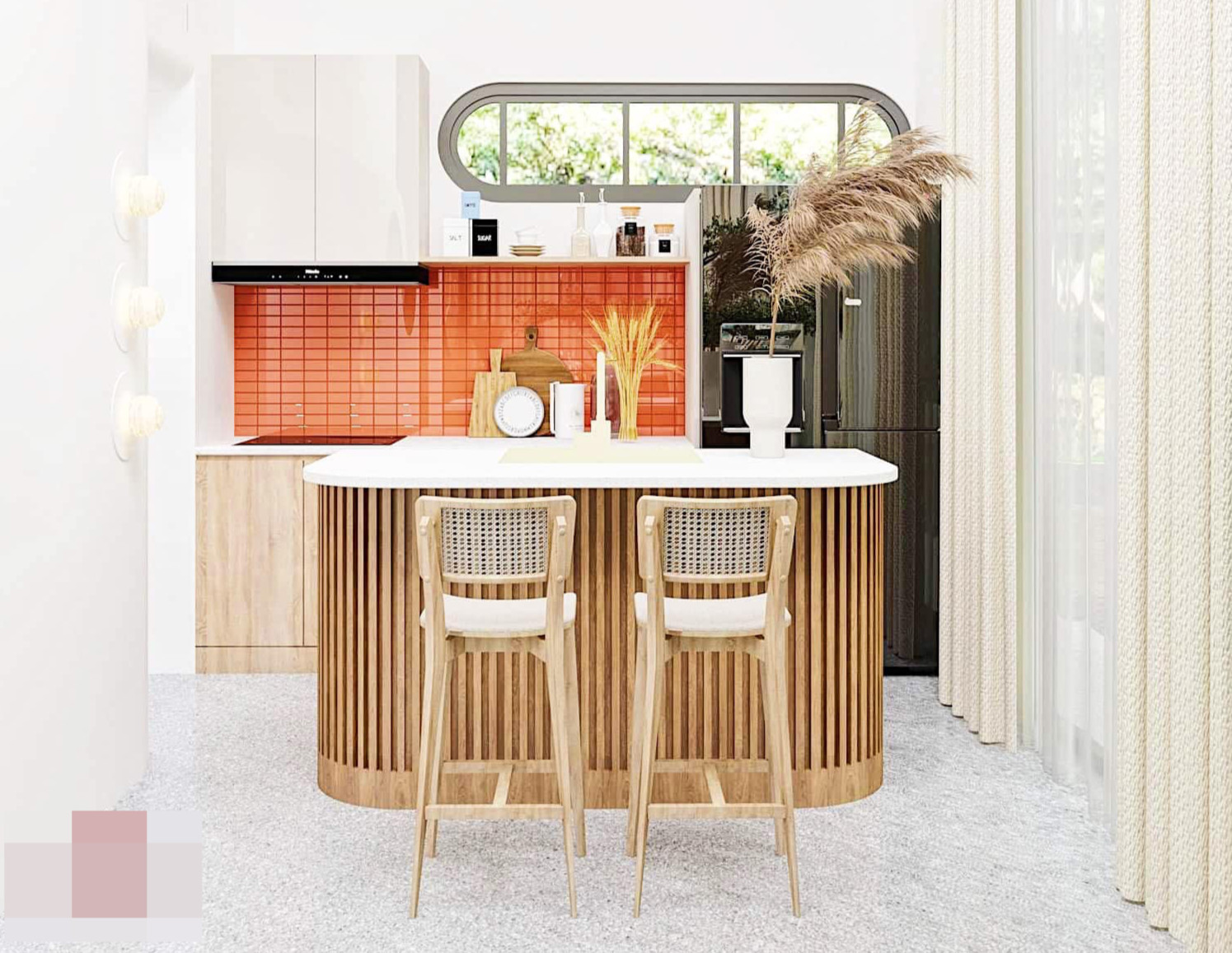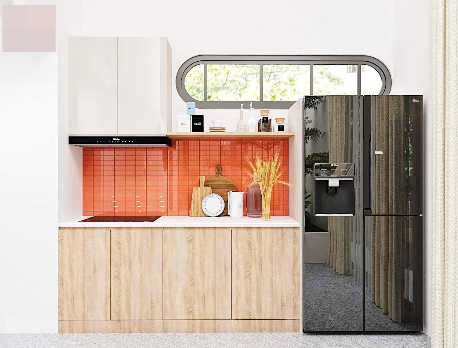 Bếp dùng màu cam cháy làm điểm nhấn, nổi bật trên nền sơn trắng, tủ màu gỗ. Khu vực nấu và sơ chế được tách biệt. Trong đó phần tủ bếp sát tường là nơi đặt bếp nấu. Bàn đảo kết hợp bàn ăn là chỗ lắp máy rửa bát, bồn sơ chế.