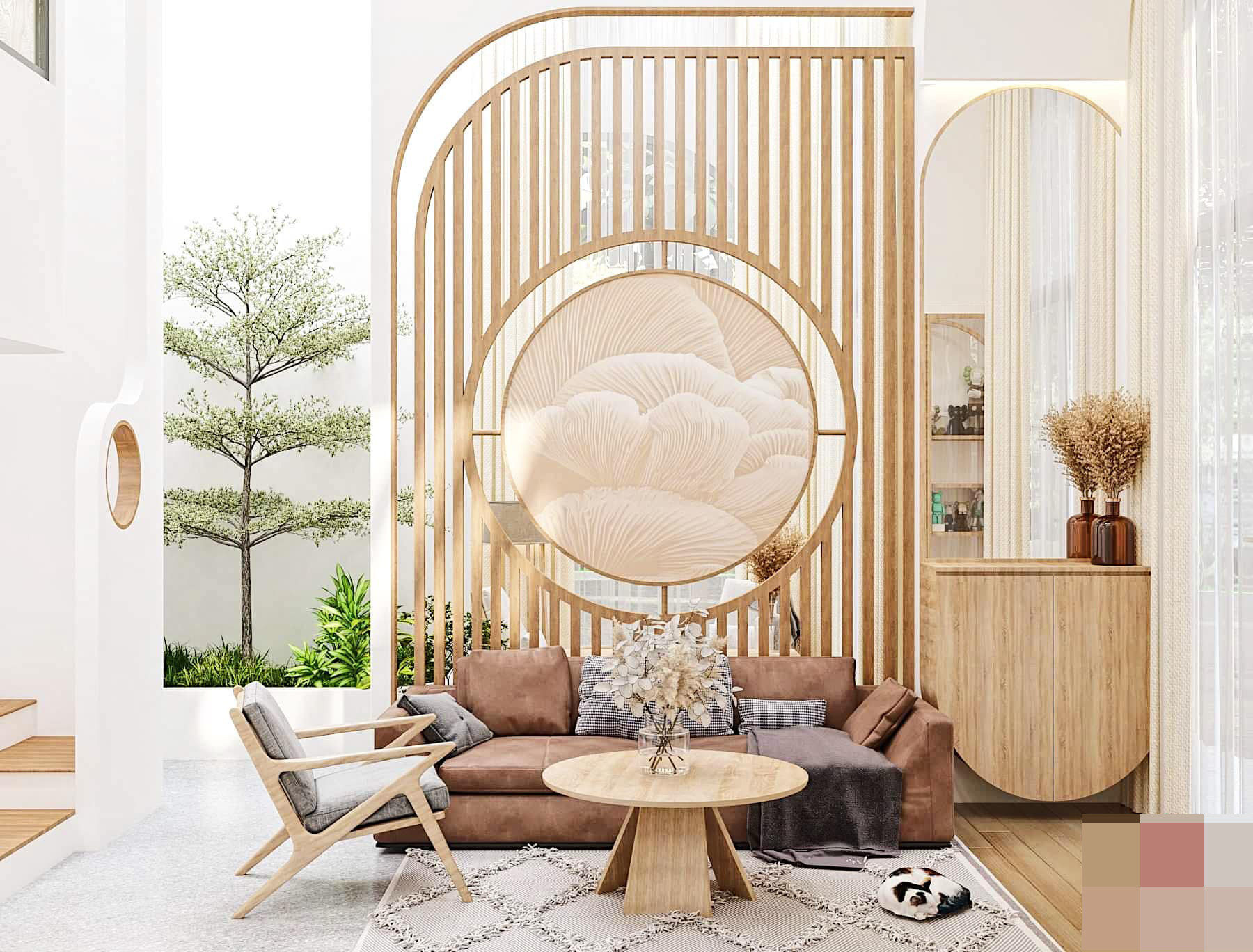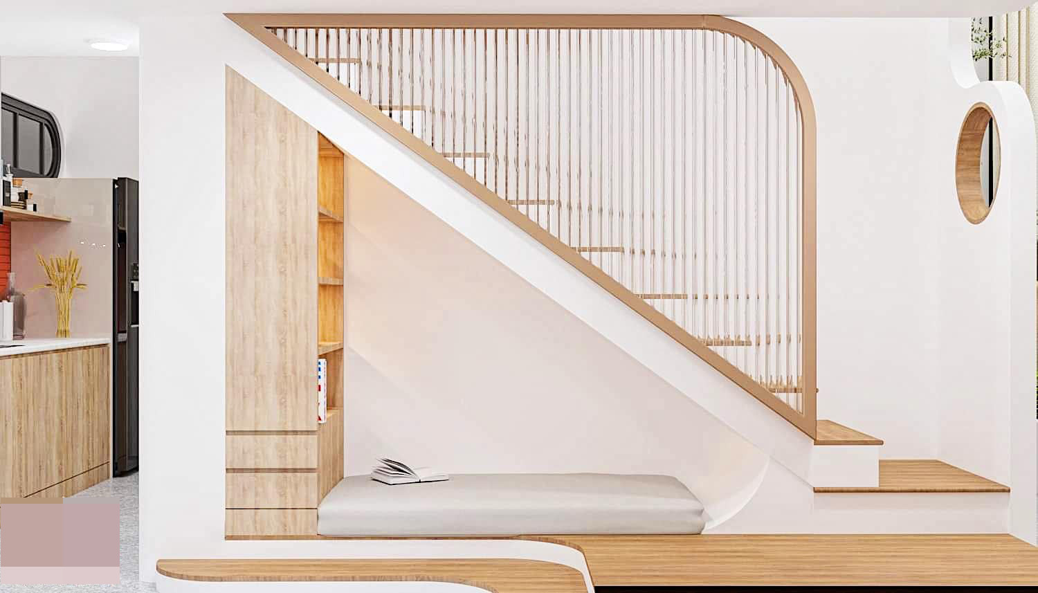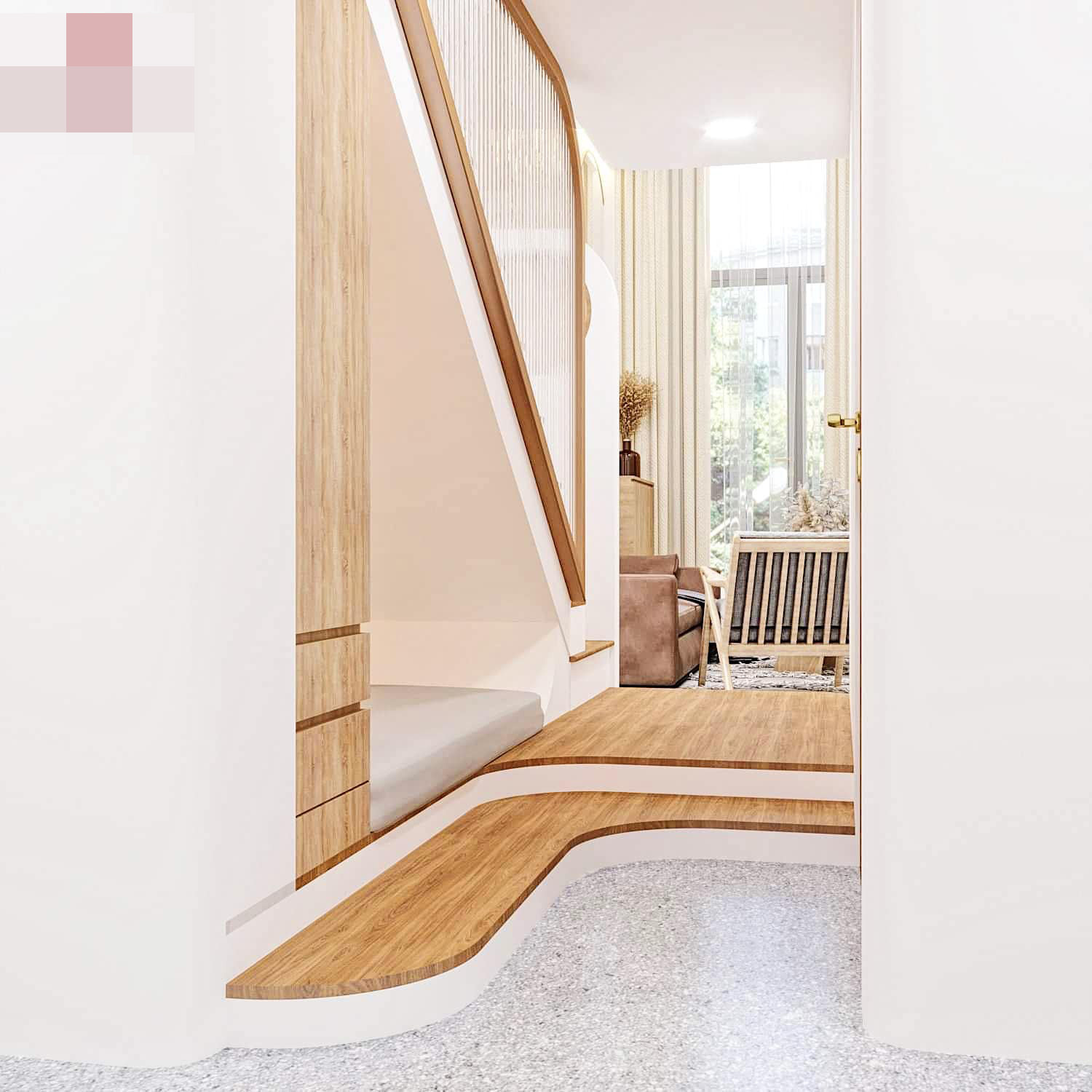 Điểm đặc biệt anh Quý đưa vào chính là tấm ngăn trang trí không gian phòng khách và khoảng nghỉ nhìn ra vườn. Chất liệu gỗ được sử dụng để tổng hòa với màu tường và các đồ nội thất nâu nhạt, tạo cảm giác ấm cúng cho tổ ấm của đôi vợ chồng. Cầu thang dẫn lên tầng 2 cũng thiết kế mở để tạo cảm giác thoáng không bị bí bách.