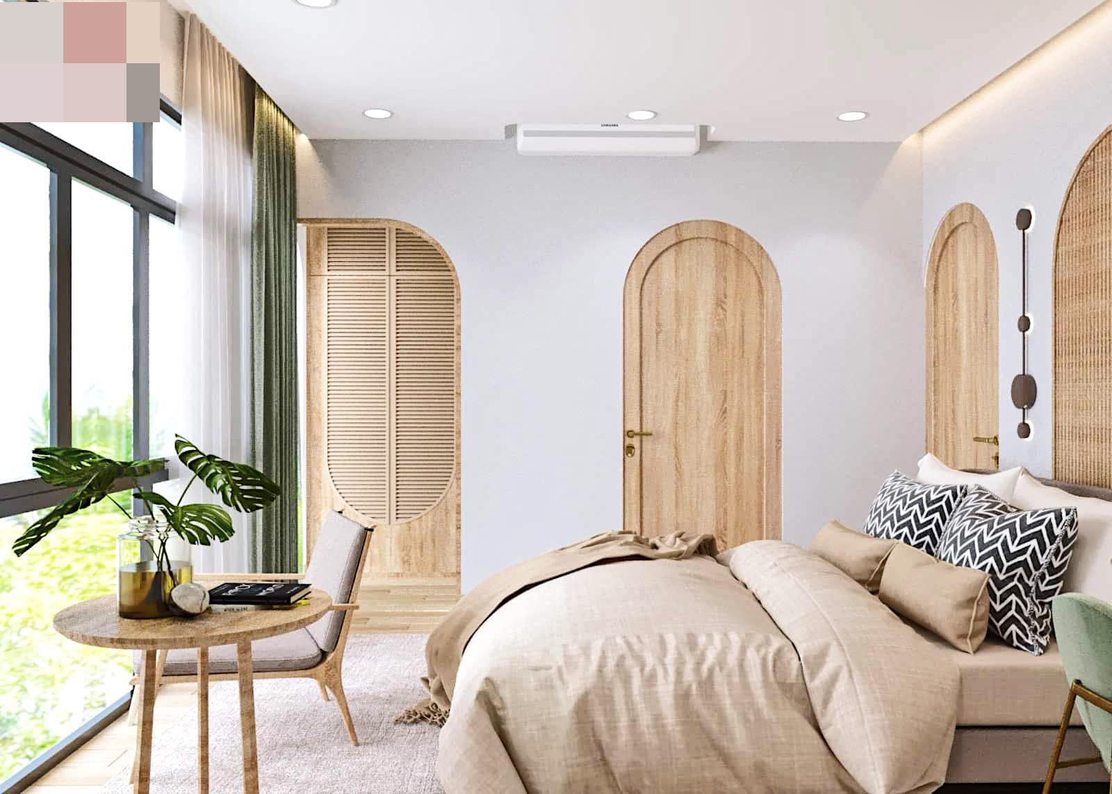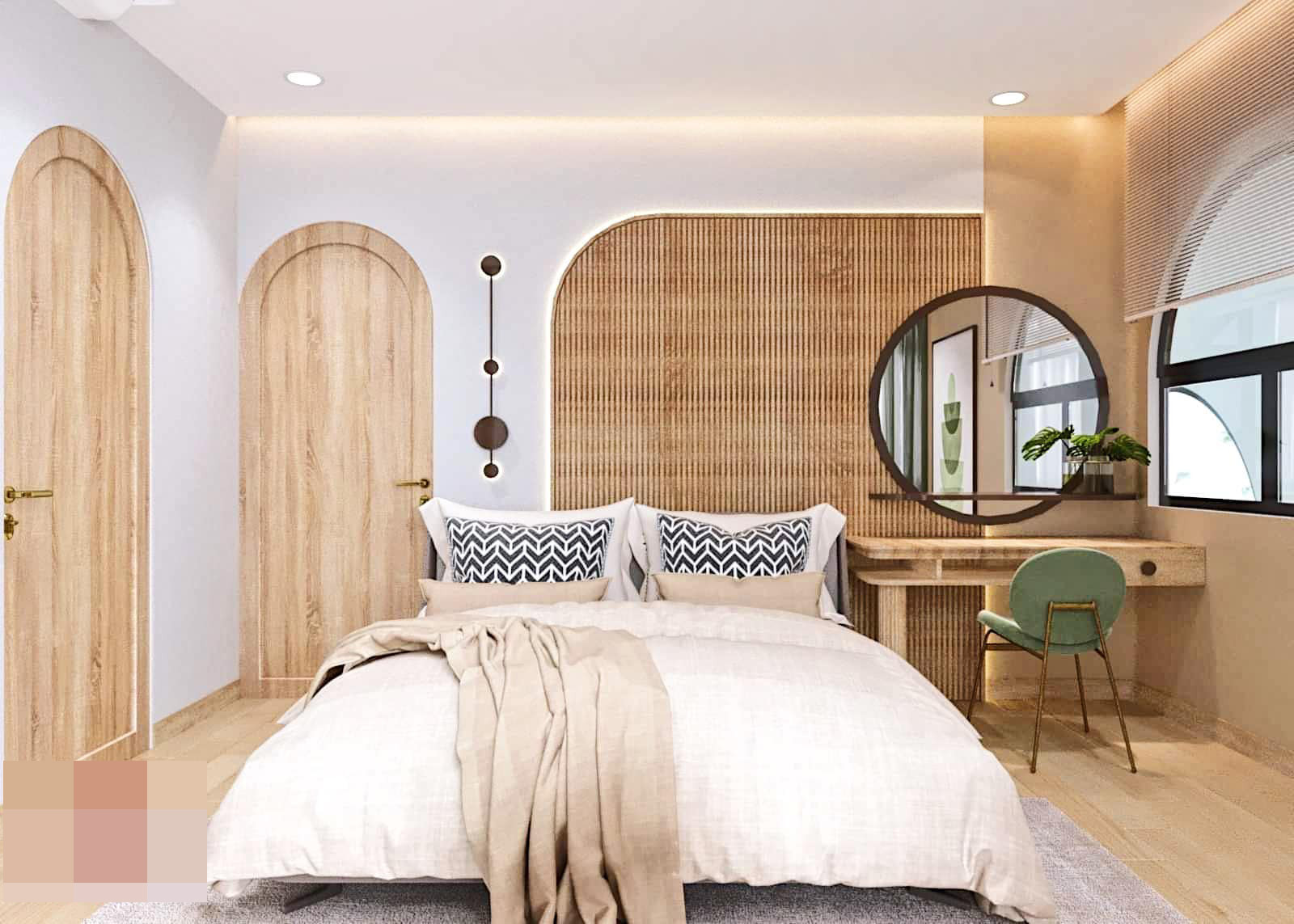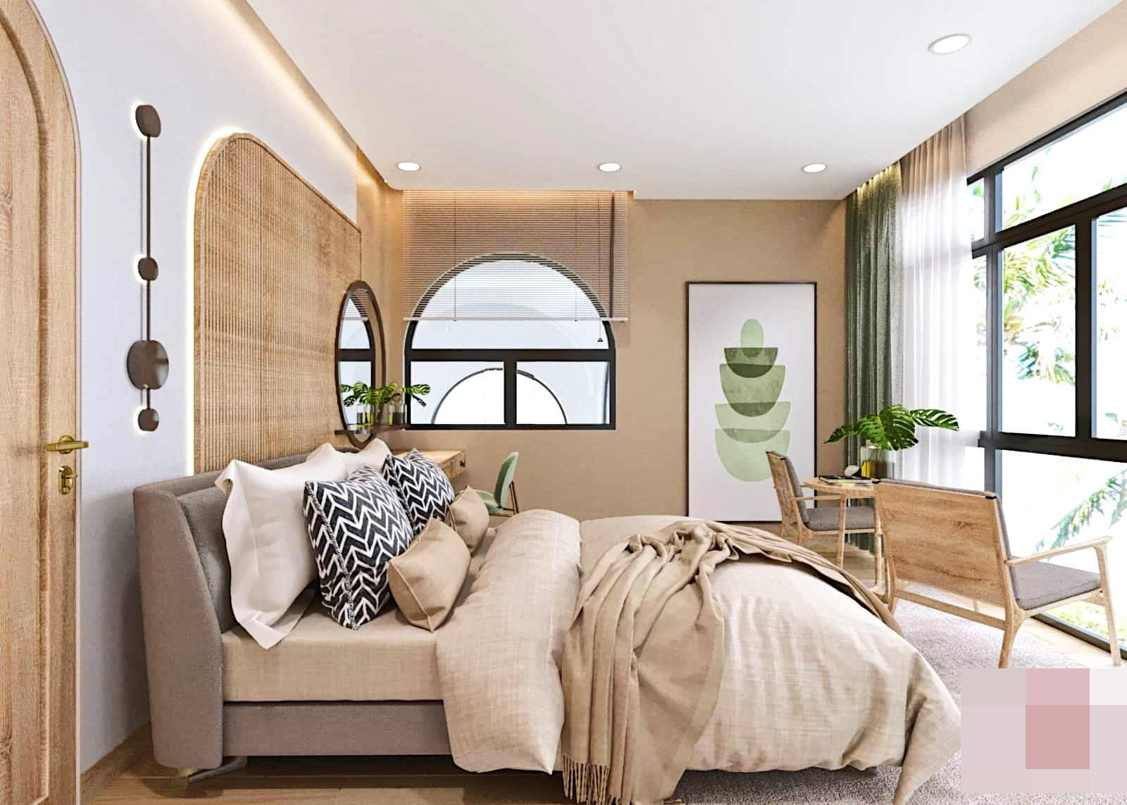 Phòng ngủ được thiết kế với ô cửa sổ lớn bằng kính, với hệ thống rèm che phối màu với những bức tranh trang trí để tạo nên một chút điểm nhấn cho căn phòng.