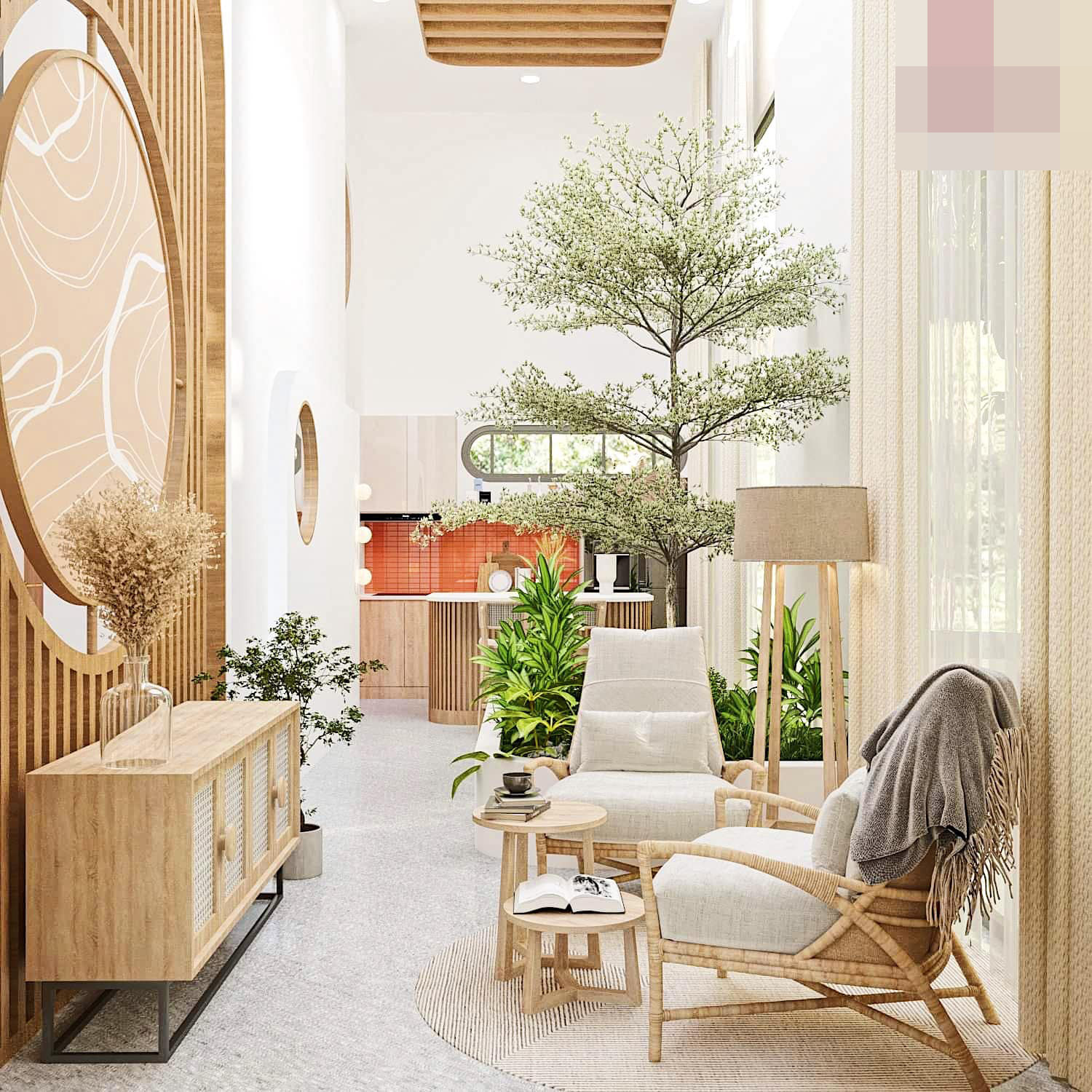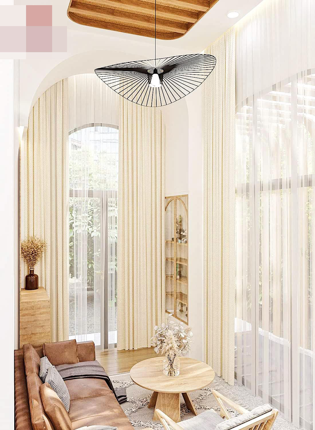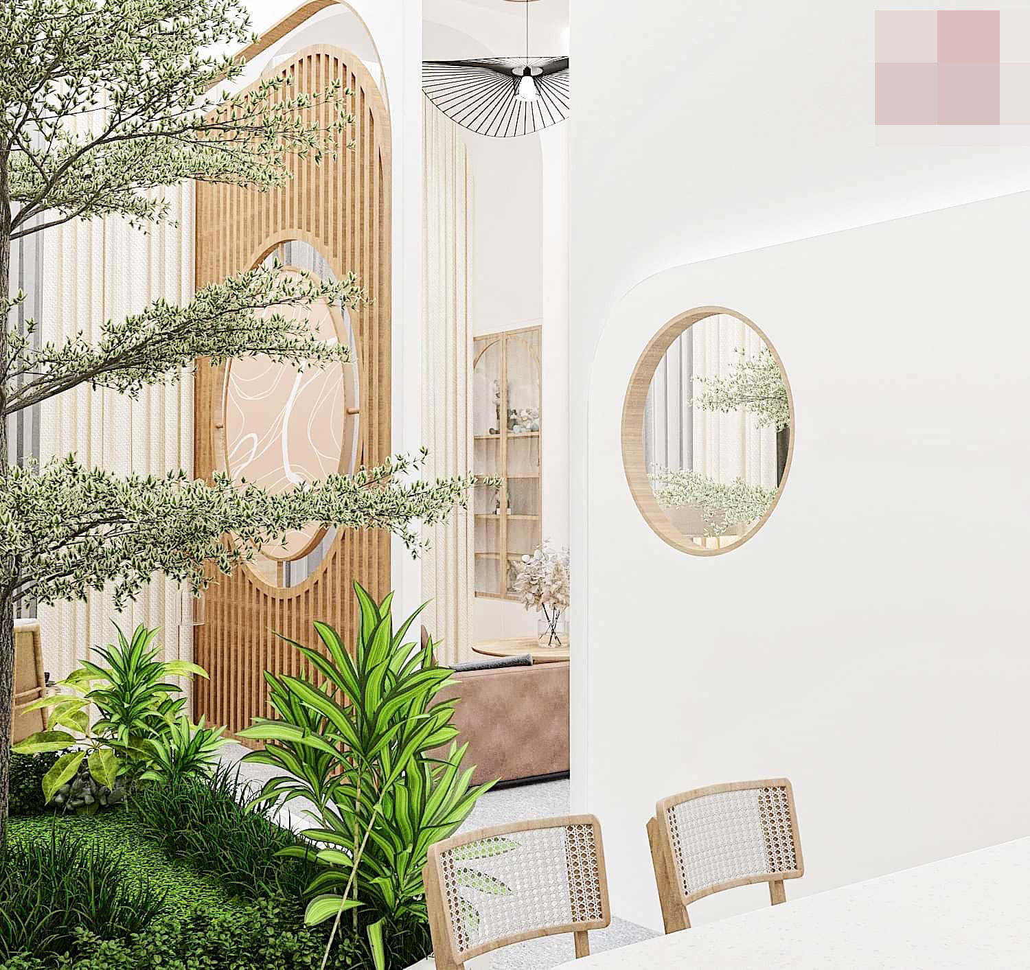 Gia chủ rất thích sử dụng hệ cửa hình vòm kết hợp với một khoảng hiên nhà vừa đủ, kết hợp khoảng xanh trong nhà. Kiến trúc sư Anh Quý đặt một khoảng nhỏ vừa để trồng cây cảnh, vừa để ngăn không gian phòng khách và bếp. Nhờ đó, ngôi nhà vẫn thoáng, có không gian mở, vừa giữ được công năng riêng biệt giữa 2 khu vực.