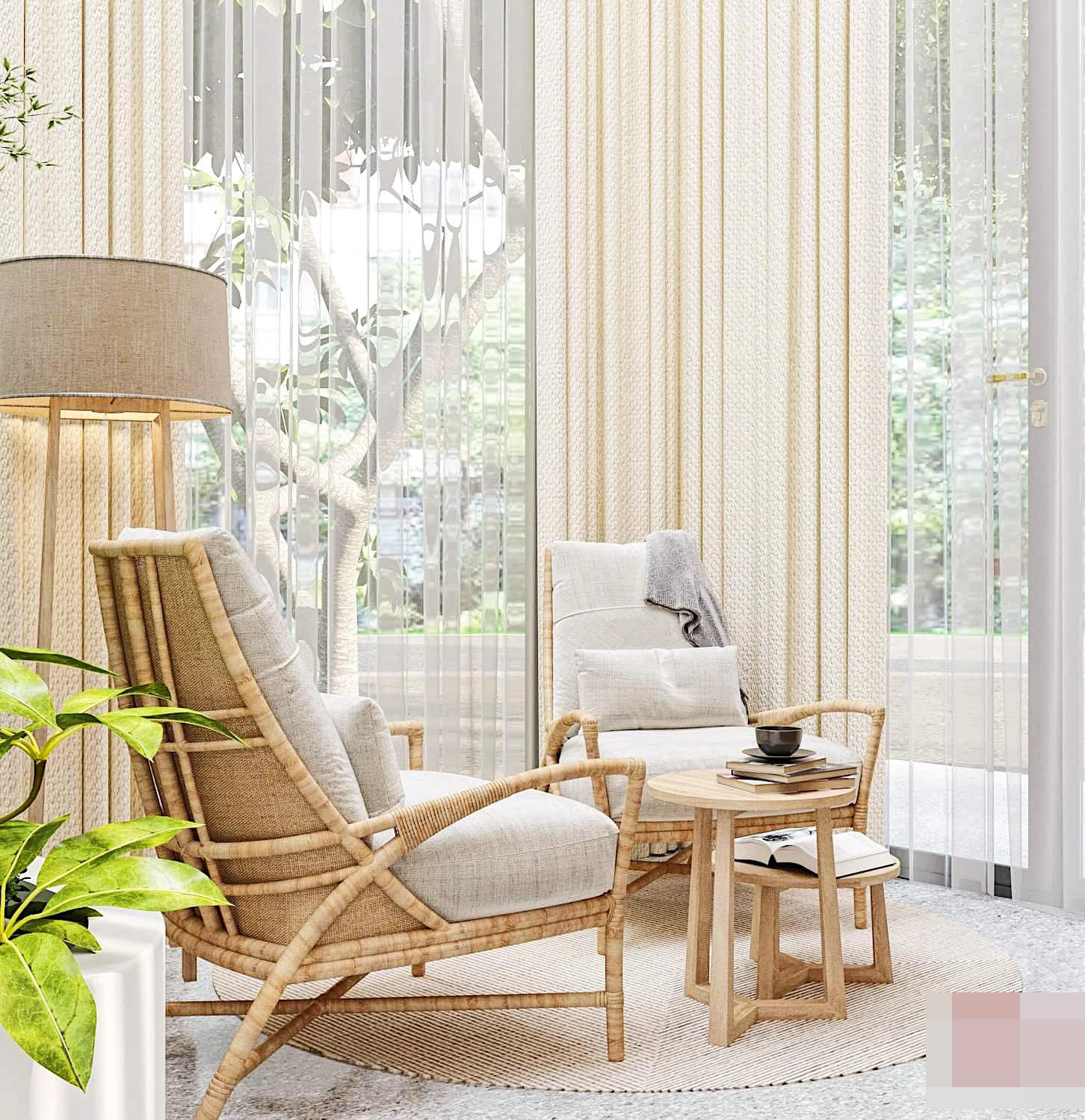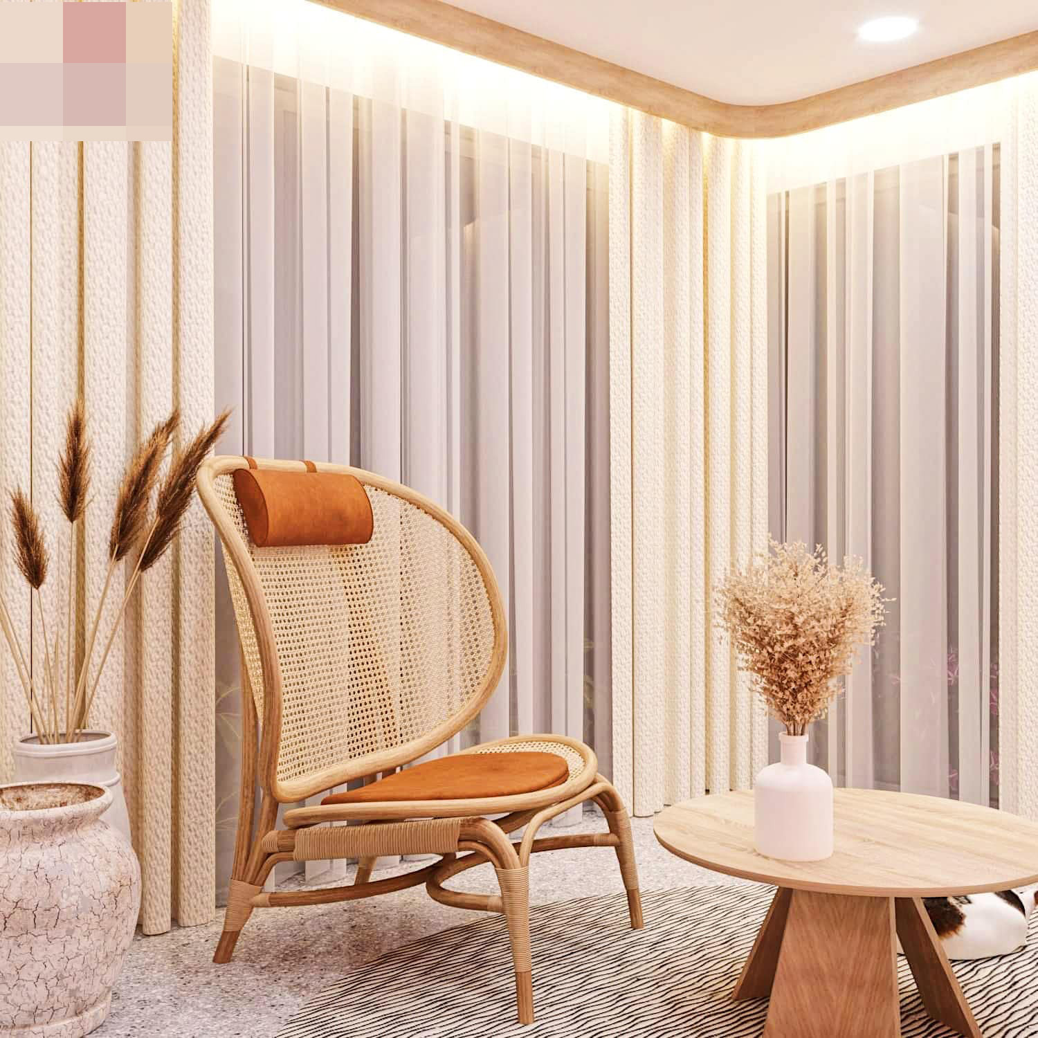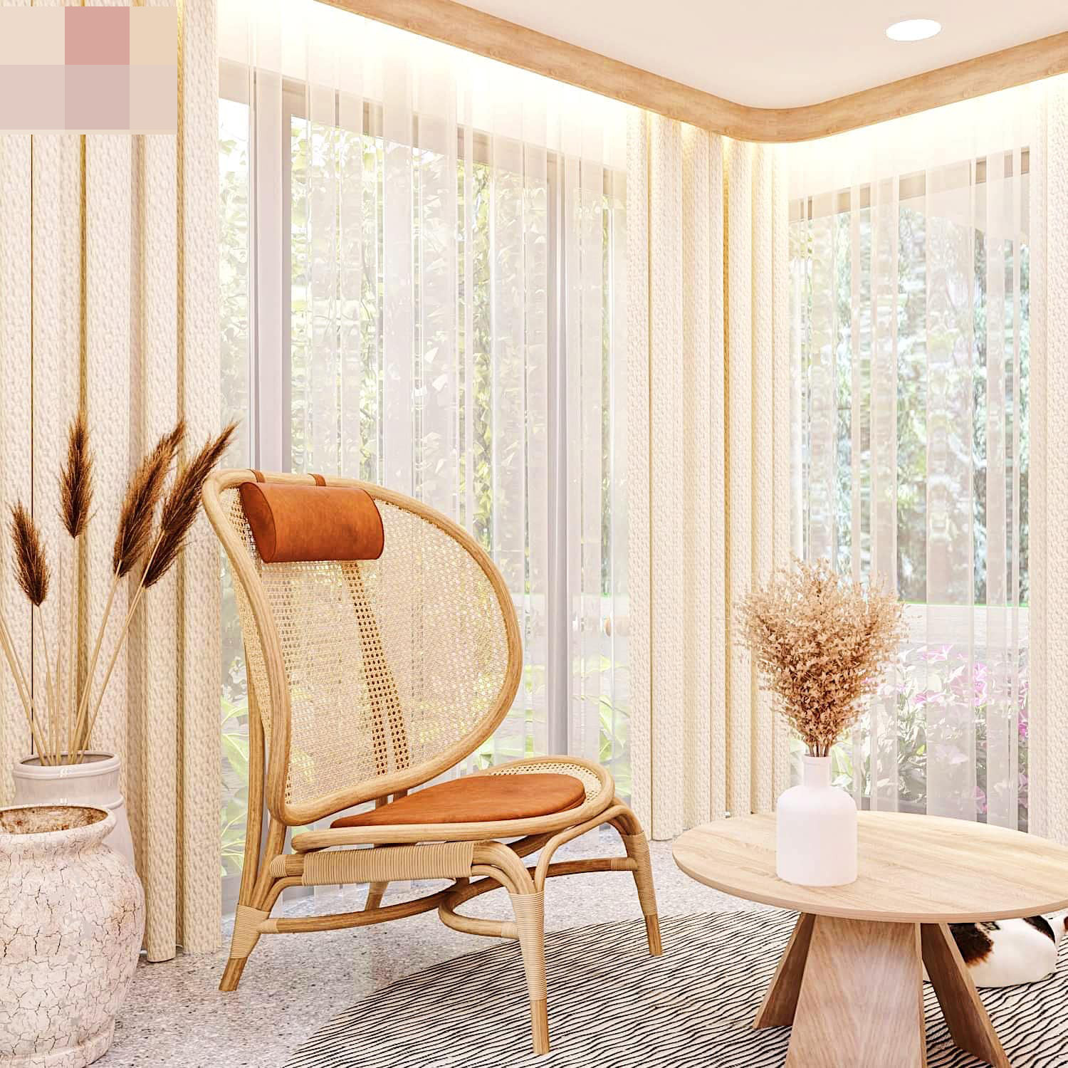 Góc chill trong nhà, hướng ra ngoài vườn, bên cạnh là khoảng sân vườn mini dưới giếng trời. Mỗi ngày đôi vợ chồng trẻ sẽ có nhiều suy nghĩ tích cực, lên kế hoạch cho những dự định trong tương lai hay đơn giản là tận hưởng khoảnh khắc hạnh phúc.
