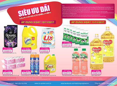 Thuộc chuỗi hoạt động tri ân tháng 11, hệ thống siêu thị Co.opmart và Co.opXtra tiếp tục áp dụng “Siêu ưu đãi” cho hàng nghìn sản phẩm với mức giảm ít nhất là 29.600đ và mức cao nhất là 1.180.000đ cho 3 ngày cuối tuần từ 10 đến 12/11/2017.