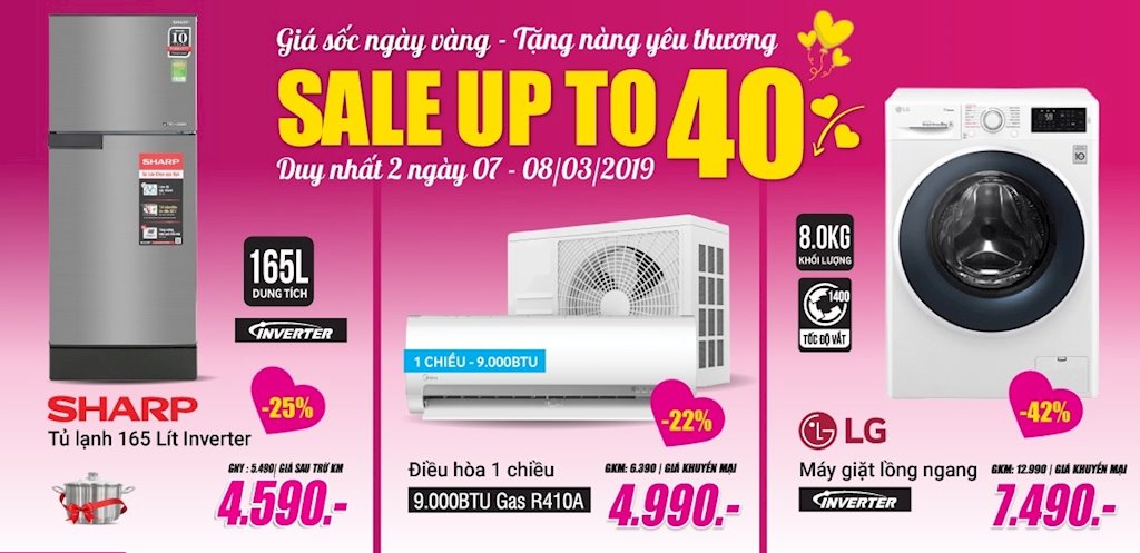 Như chương trình 8300 sản phẩm đồng giá, trong đó đa dạng mặt hàng như tivi, máy giặt, tủ lạnh, nồi cơm điện… được thực hiện trong hai ngày 7 và 8/3/2019. Đáng chú ý, sản phẩm tivi 4K Samsung, Panasonic đồng giá 7,9 triệu đồng; Smart TV 49inch Samsung, Toshiba đồng giá 8,9 triệu đồng.