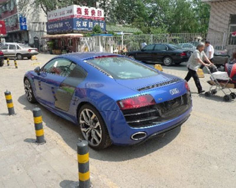 Chiếc Audi R8 V10 biển tứ quý 8 đỗ trước một câu lạc bộ âm nhạc tại Bắc Kinh. Bên cạnh mẫu xe này còn có sự xuất hiện của chiếc Greatwall C30 màu trắng.