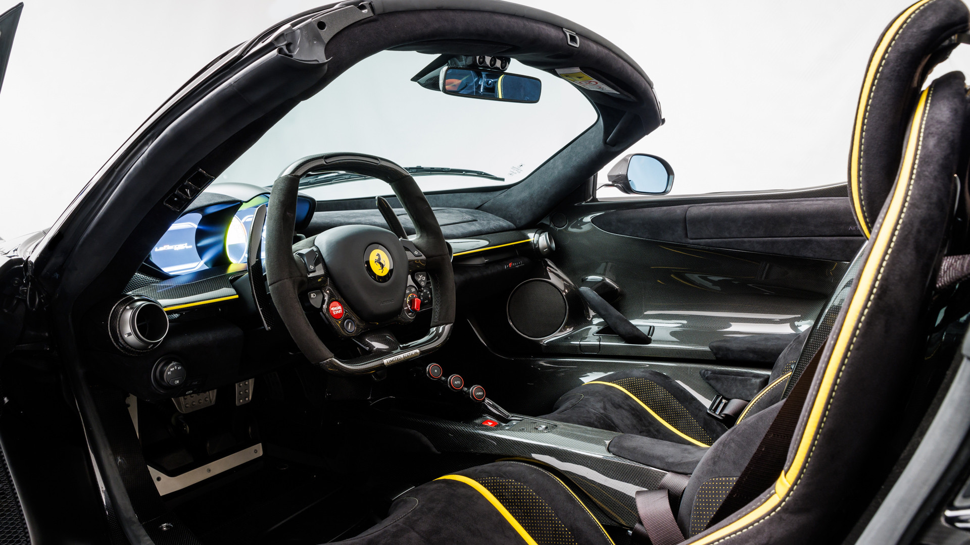 Tương tự ngoại thất, nội thất của chiếc LaFerrari Aperta cũng mang tông màu tối với chất liệu chính Alcantara. Các chi tiết như tựa đầu, lưng ghế, bảng taplo… được trang trí bằng các đường chỉ vàng tương phản. Sự khác biệt đáng kể duy nhất là hệ thống xoay cửa: khi mở hoàn toàn, cơ cấu trên LaFerrari Aperta được điều chỉnh lại với góc xoay khác biệt so với phiên bản coupe.