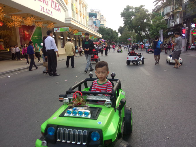 Ngay từ đầu đường Đinh Tiên Hoàng, mặt trung tâm thương mại Tràng Tiền Plaza, một loạt xe điện cũng được bày ra, thu hút các trẻ nhỏ tham gia.