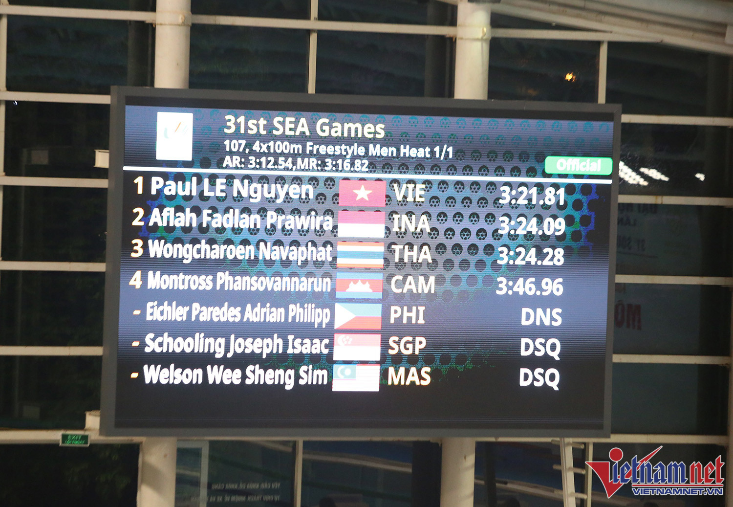 Ở nội dung tiếp sức 4x100 tự do nam, kết quả được BTC công bố sau khi cuộc tranh tài kết thúc, Singapore giành HCV, Malaysia HCB, còn chủ nhà Việt Nam giành HCĐ.