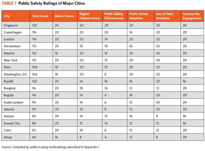 Singapore, Copenhagen, London là những thành phố đứng đầu danh sách xếp hạng, trong khi các thành phố như Kuwait, Cairo và Abuja lại đang tụt hậu so với các thành phố khác. Trước đây các thành phố này đều có các chương trình nghị sự rõ ràng về an toàn công cộng với các nguồn tài chính đáng kể và cơ sở hạ tầng vững chắc mà họ có thể tạo ra các kết quả an ninh tích cực.