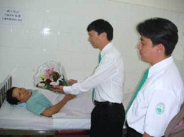 | Lãnh đạo Công ty Mai Linh tặng hoa cho chị Giang tại Bệnh viện Từ Dũ, TP.HCM. (Ảnh: NLĐO) |