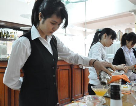 | Sinh viên Trường CĐ Du lịch Hà Nội trong tiết học pha chế đồ uống. |