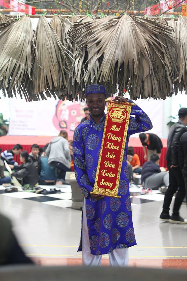 Du học sinh Nigeria trong trang phục truyền thống của Việt Nam tham dự các hoạt động tại ĐH FPT. |