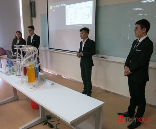 “Tôi sẽ mua lại sản phẩm này của nhóm các bạn” thầy Đỗ Công Hùng (Giảng viên ngành Kỹ thuật phần mềm) khẳng định sau khi thưởng thức ly cocktail pha chế bởi Barista - máy pha đồ uống do nhóm sinh viên Nguyễn Thái Dương, Nguyễn Lê Thu Hiền, Cao Hoàng Anh, Phùng Tiến Đạt nghiên cứu và phát triển. Đây có lẽ là một trong số ít sản phẩm đồ án được thương mại hóa thành công ngay tại buổi bảo vệ.