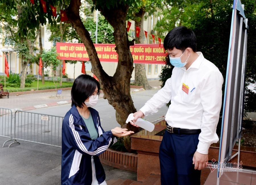 Trước tình hình dịch Covid-19 diễn biến phức tạp, để đảm bảo an toàn trong suốt quá trình bầu cử, Trường ĐH Kinh tế Quốc dân cũng yêu cầu sinh viên chấp hành quy định 5K. Sinh viên đến bỏ phiếu được yêu cầu sát khuẩn tay, đo thân nhiệt ngay trước khu vực bỏ phiếu.