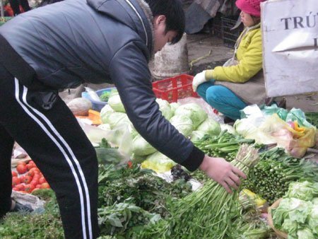 - Ngó qua một lượt các loại rau củ quả được bầy bán, cậu sinh viên phân vân vì không biết nên lấy loại rau nào, cứ nâng lên hỏi giá lại đặt xuống vì mỗi mớ rau cải nhỏ nhẹm một bàn tay 5-6 nghìn đồng….