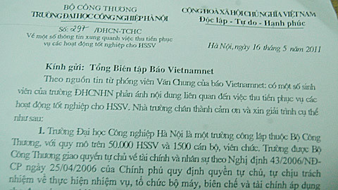 Ngày 16/6, VietNamNet đã nhận được văn bản trả lời số 297/ĐHCN-TCHC từ hiệu trưởng nhà trường giải thích về bức xúc của sinh viên.