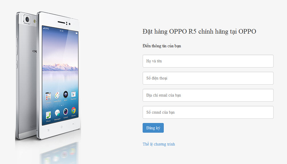 Trên website chính thức của Oppo Việt Nam xuất hiện thông báo cho phép người dùng có thể đặt mua smartphone Oppo R5 với giá 9,99 triệu đồng. Riêng đợt đặt hàng đầu tiên, Oppo tặng thêm cho người dùng là cục pin sạc dự phòng VOOC trị giá 1,6 triệu đồng.