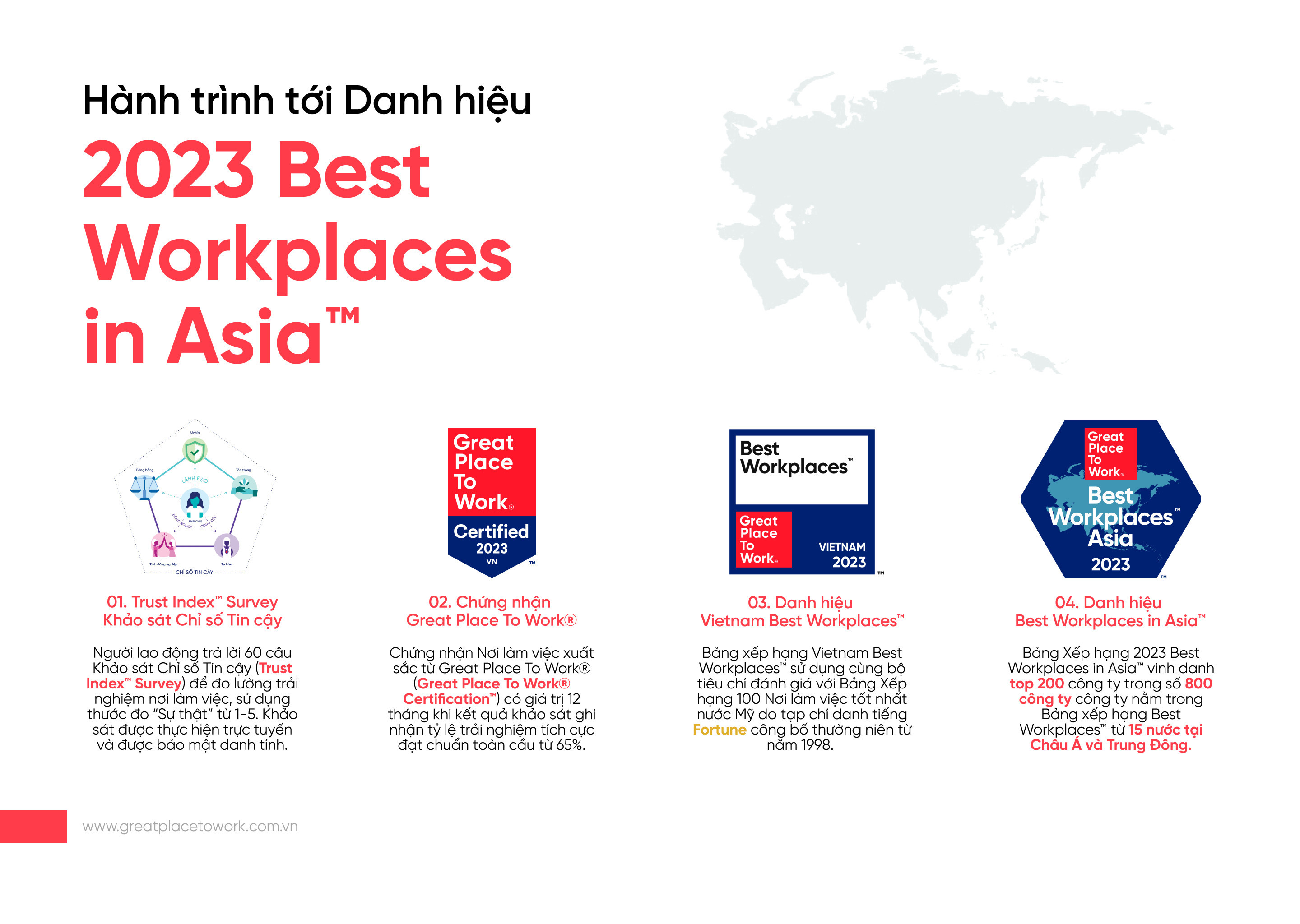 Great Place To Work đã thực hiện khảo sát 2,1 triệu người lao động trên khắp châu Á và Trung Đông về những yếu tố chính tạo nên một “Nơi làm việc xuất sắc” và tiến hành phân tích các chương trình văn hóa có sức ảnh hưởng tới 5,9 triệu người lao động trong khu vực.