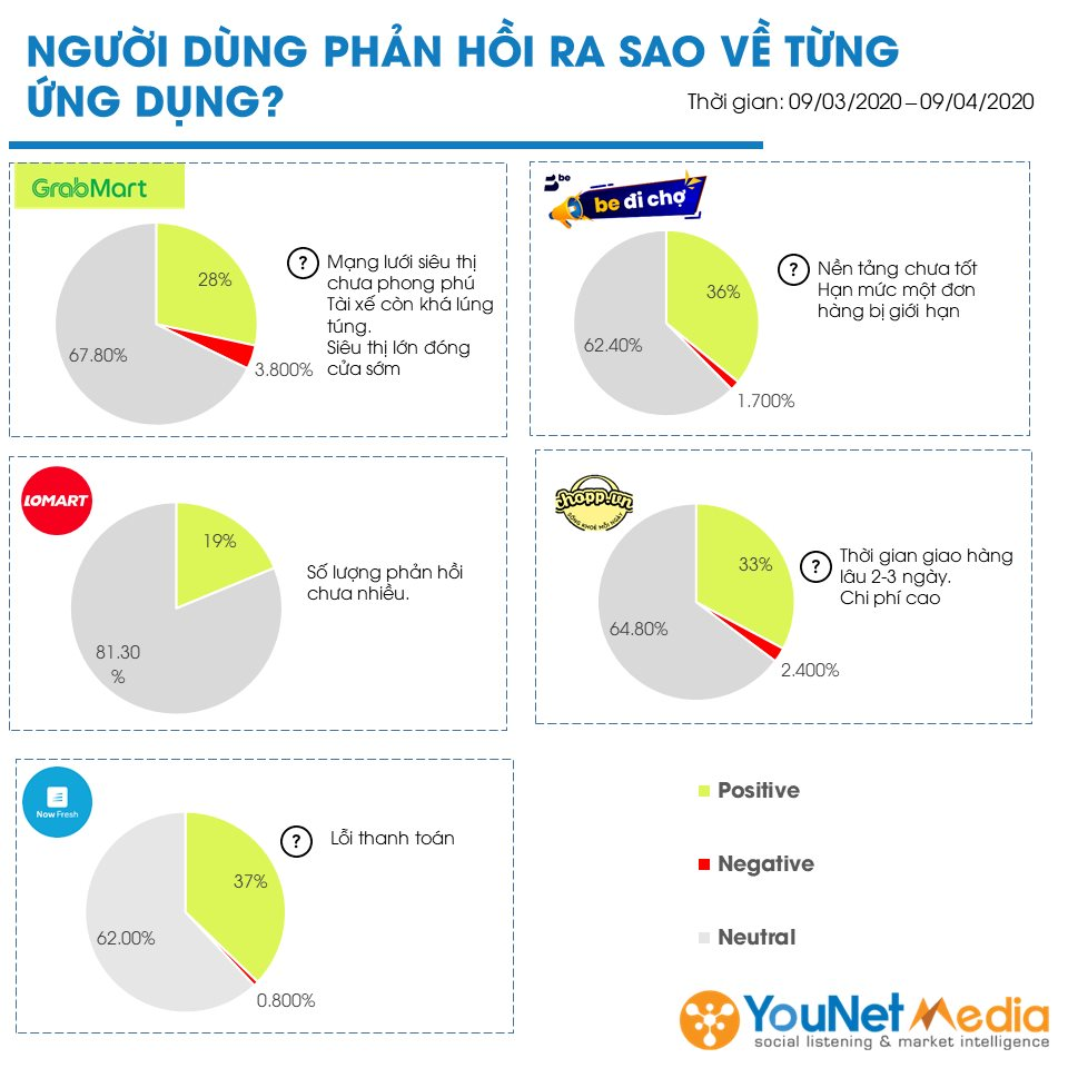 Tính năng be Đi chợ ra mắt đầu tháng 3, GrabMart ra mắt cuối tháng 3 ở TP.HCM và đầu tháng 4 ở Hà Nội. NowFresh, Chopp, Lomart ra mắt đã được vài năm. Trong khoảng thời gian từ 9/3-9/4, số lượng bàn luận trên mạng xã hội về GrabMart vượt hơn hẳn so với các ứng dụng còn lại. Tiếp đến là be Đi chợ và NowFresh. Chopp và Lomart nhận được ít bình luận hơn.