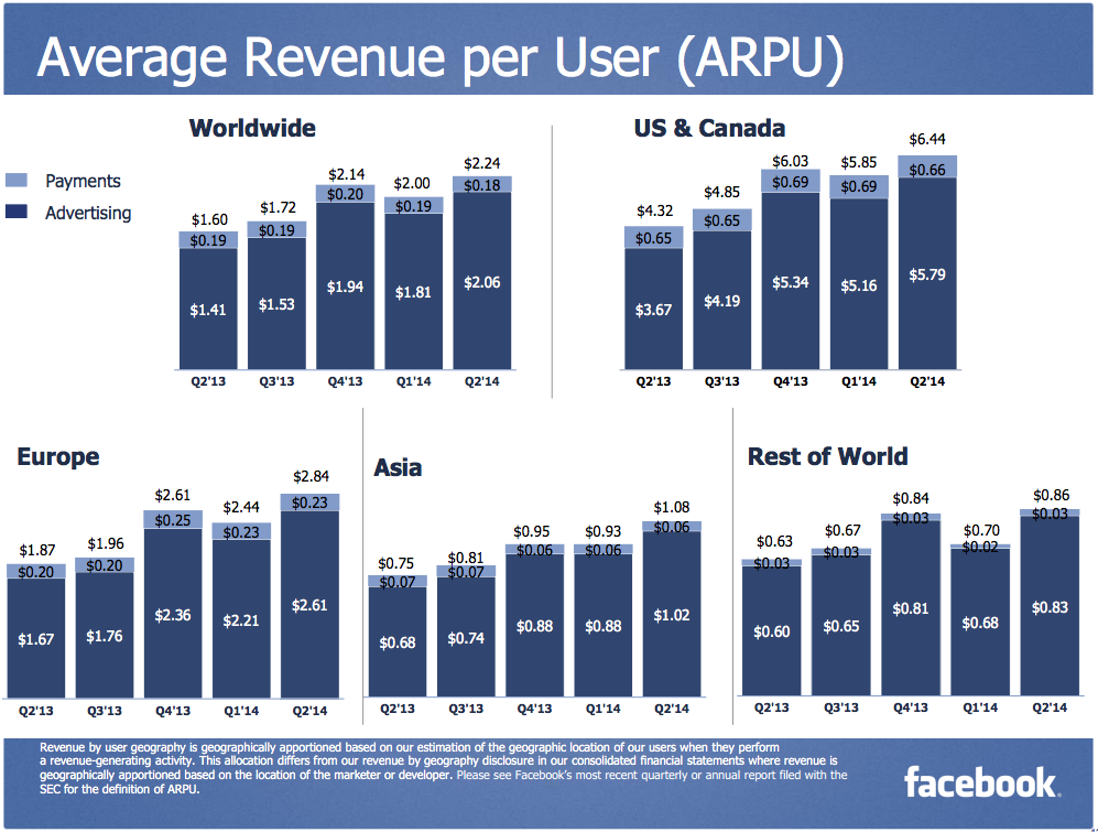 Doanh thu trên mỗi người dùng Facebook cao kỷ lục trên mọi khu vực. Tuy nhiên, một khoảng tối trong báo cáo doanh thu của hãng là doanh thu từ thanh toán, giảm từ 237 triệu USD quý I xuống 234 triệu USD.