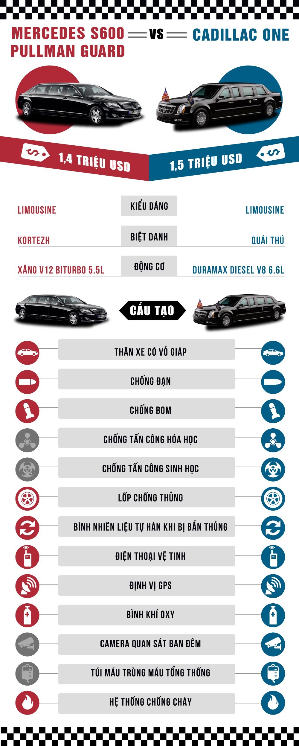 "Quái thú" của Tổng thống Donald Trump sở hữu nhiều trang bị an toàn hơn và giá cũng đắt hơn so với chiếc limousine chống đạn của Tổng thống Nga Putin.