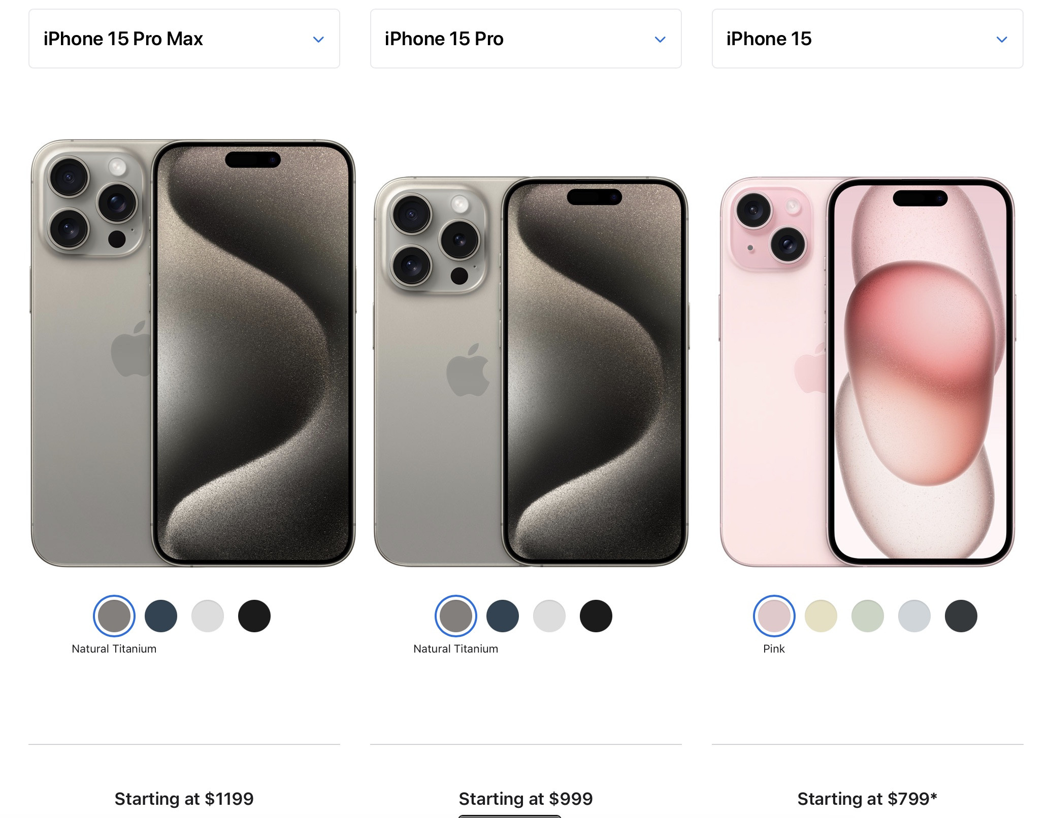 Apple vừa công bố bốn mẫu iPhone 15 mới trong sự kiện Wonderlust, bao gồm iPhone 15, 15 Plus, 15 Pro và 15 Pro Max. iPhone 15 và 15 Pro dùng màn hình 6.1 inch, còn iPhone 15 Plus và 15 Pro Max dùng màn hình 6.7 inch.