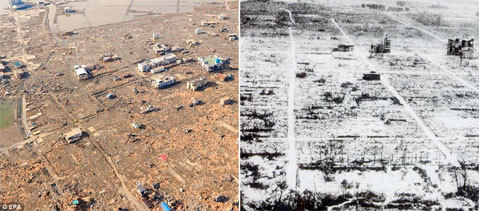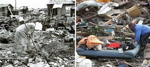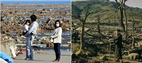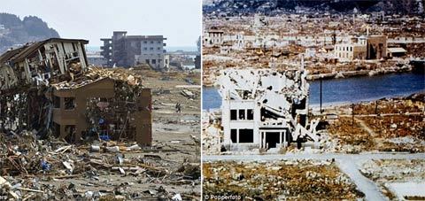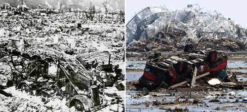 Nhật Bản đang đối mặt với thảm họa tồi tệ nhất kể từ Thế chiến II. Những bức ảnh về sự tàn phá sau động đất và sóng thần hôm 11/3 ở đông bắc nước này cho thấy sự tương đồng với cảnh tượng ở Hiroshima và Nagasaki năm 1945 khi bị đánh bom nguyên tử.