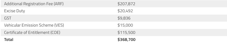 Ngoài giấy chứng nhận quyền mua xe, người dân tại Singapore còn phải chịu thêm các loại thuế sở hữu phương tiện khác như phí đăng ký, phí đăng ký bổ sung, phí đăng ký bổ sung ưu đãi, thuế tiêu thụ đặc biệt, thuế đường bộ và thuế đặc biệt.