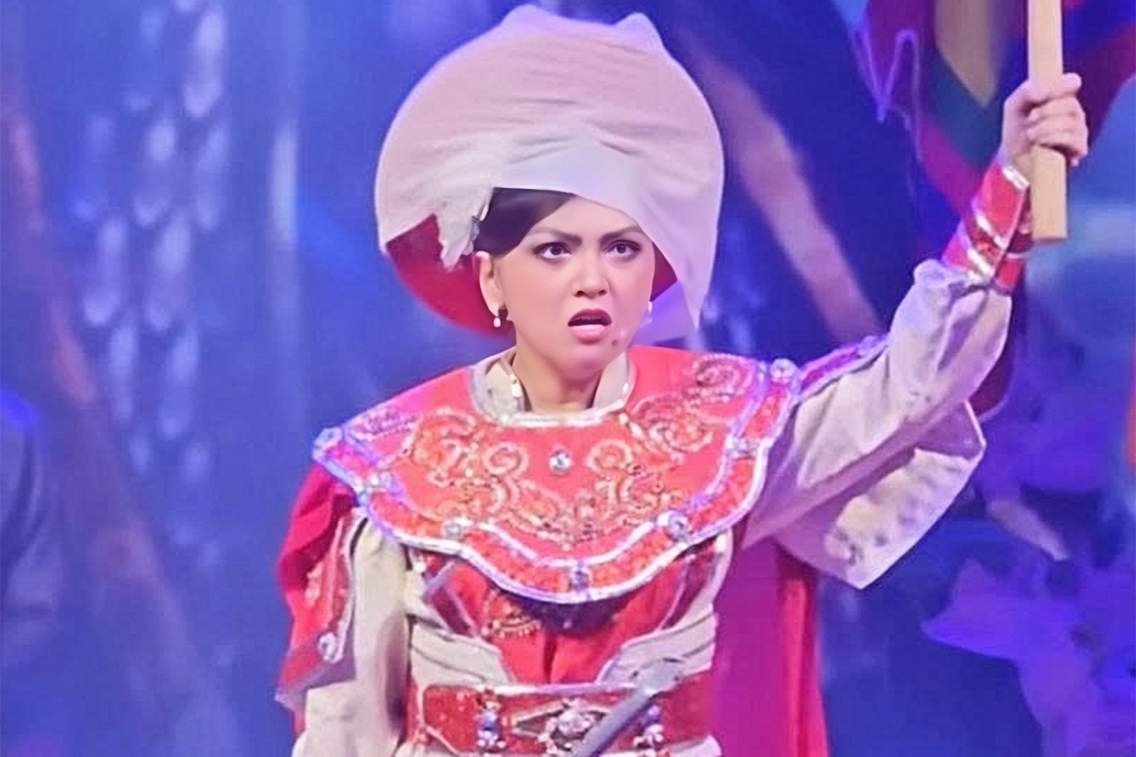 Cụ thể, Bùm Bum thể hiện nhân vật Trưng Trắc trong Tiếng trống Mê Linh - vở diễn từng ghi dấu ấn của NSƯT Thanh Nga cùng loạt tên tuổi gạo cội.