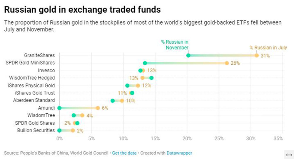 Nguồn tin từ hai quỹ hoán đổi danh mục (ETF) có hàng trăm tấn vàng cho biết, họ muốn thoái vốn khỏi vàng từ Nga. Các quỹ ETF nắm giữ vàng thỏi nhiều nhất và nhiều quỹ niêm yết công khai số thỏi mà họ sở hữu. Các nhà đầu tư có thể biết liệu có vàng của Nga hay không vì mỗi thanh đều được đóng dấu xuất xứ.