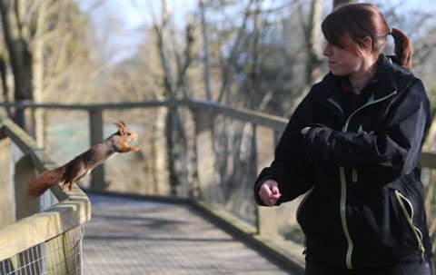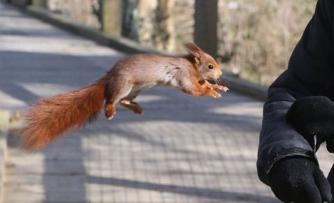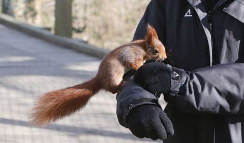 Có thể vì đói, một con sóc đỏ trong công viên Escot ở East Devon, Anh đã mạo hiểm bay trong không trung và rốt cuộc đáp thành công xuống cánh tay một nhân viên trông coi để lục tìm thức ăn trong túi áo khoác của người này.