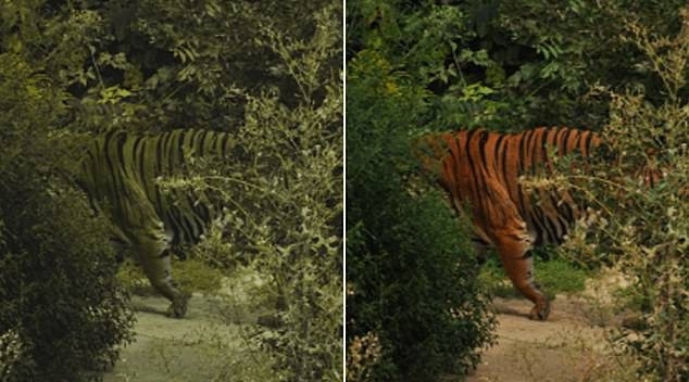 Đáp án: Màu lông đỏ cam của loài hổ tưởng chừng không hề phù hợp để săn mồi trong rừng. Nhưng với các loài móng guốc như hươu, nai, hoẵng,… mắt của chúng chỉ có thể tiếp nhận sóng ánh sáng lục và lam. Do đó, chúng nhìn loài hổ sẽ có màu xanh, trùng với màu của cây rừng. Kết hợp với các sọc đen gây rối mắt khiến chúng không thể phát hiện ra hổ một cách dễ dàng.