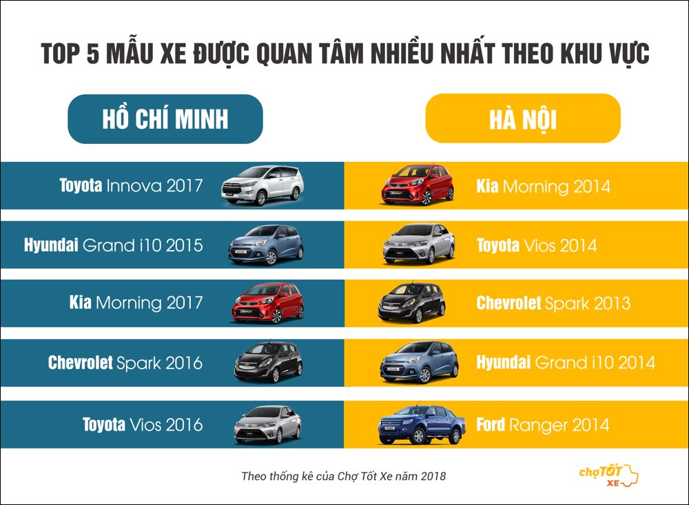 Theo thống kê hơn 160.000 tin đăng trên Chợ Tốt Xe năm 2018, top 5 mẫu xe đã qua sử dụng đắt khách nhất tại Hà Nội hầu hết thuộc đời 2013-2014, bao gồm các dòng xe Kia Morning, Toyota Vios, Chevrolet Spark, Hyundai Grand i10, Ford Ranger. Trong khi đó, cùng những dòng xe này, người mua xe tại Tp.HCM lại dành sự quan tâm của mình cho các dòng xe tương tự nhưng đời mới hơn từ 2015 trở đi.