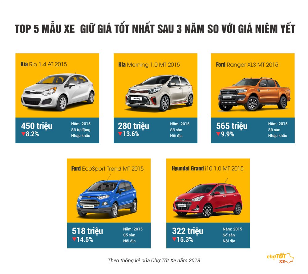 Còn đối với những ai muốn mua xe trên nguyên tắc "bảo toàn giá trị, giữ giá, dễ bán", top 5 mẫu xe giữ giá tốt được thống kế Chợ Tốt Xe là những gợi ý không thể bỏ qua. Sau 3 năm lăn bánh, top 5 mẫu xe giữ giá nhất thị trường chỉ giảm trung bình dưới 16% so với giá bán xe niêm yết ban đầu. Đây quả là một con số "đáng mơ ước" nếu chủ xe từ khi mua đã nhắm tới việc bán lại.