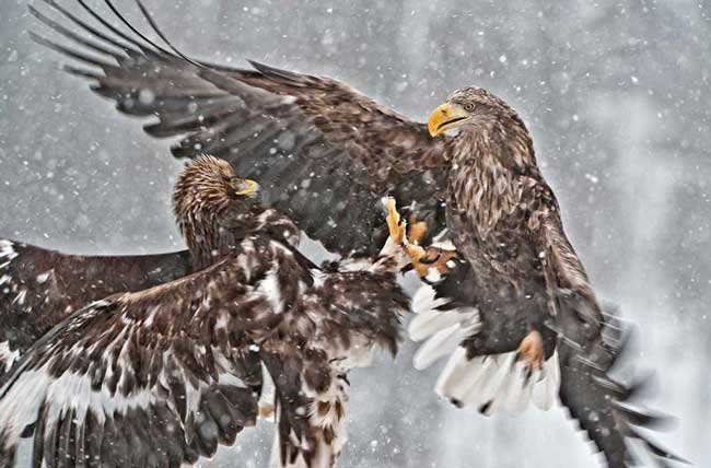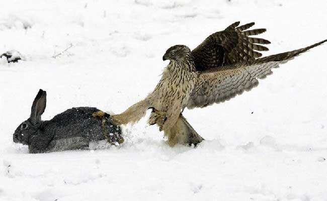 Từ trên cao đại bàng vàng lao xuống bằng tốc độ kinh khủng rồi dùng móng vuốt chắc khỏe của mình tấn công con sói. Sau những chống cự yếu ớt thì con sói dường như nằm im chịu trận trước vuốt đại bàng.