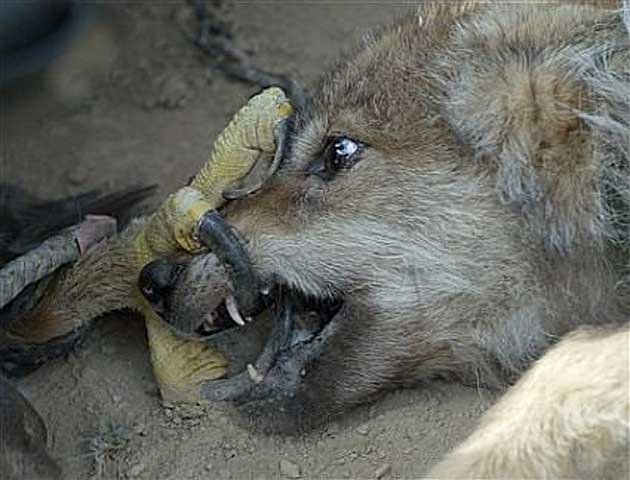 Hình ảnh chó sói nằm khuất phục dưới móng vuốt của đại bàng vàng trong một cuộc chiến giữa hai loài.