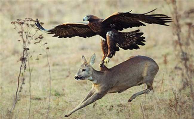 Từ trên cao đại bàng vàng lao xuống bằng tốc độ khủng rồi nhanh chóng dùng móng vuốt chắc khỏe của mình tấn công con sói. Sau những chống cự yếu ớt thì con sói dường như nằm im chịu trận trước vuốt đại bàng.