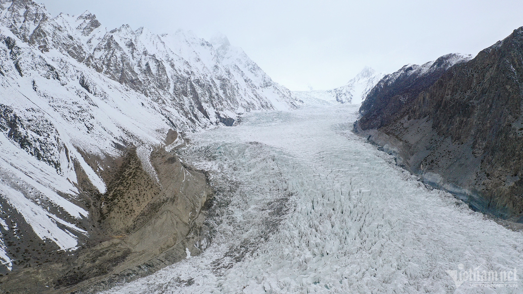 Ngoài sông băng đen, Pakistan còn có dòng sông băng màu trắng độc đáo mang tên Passu. Càng lên cao, mây mù càng bao phủ tạo nên khung cảnh mờ ảo, tiết trời rất lạnh.