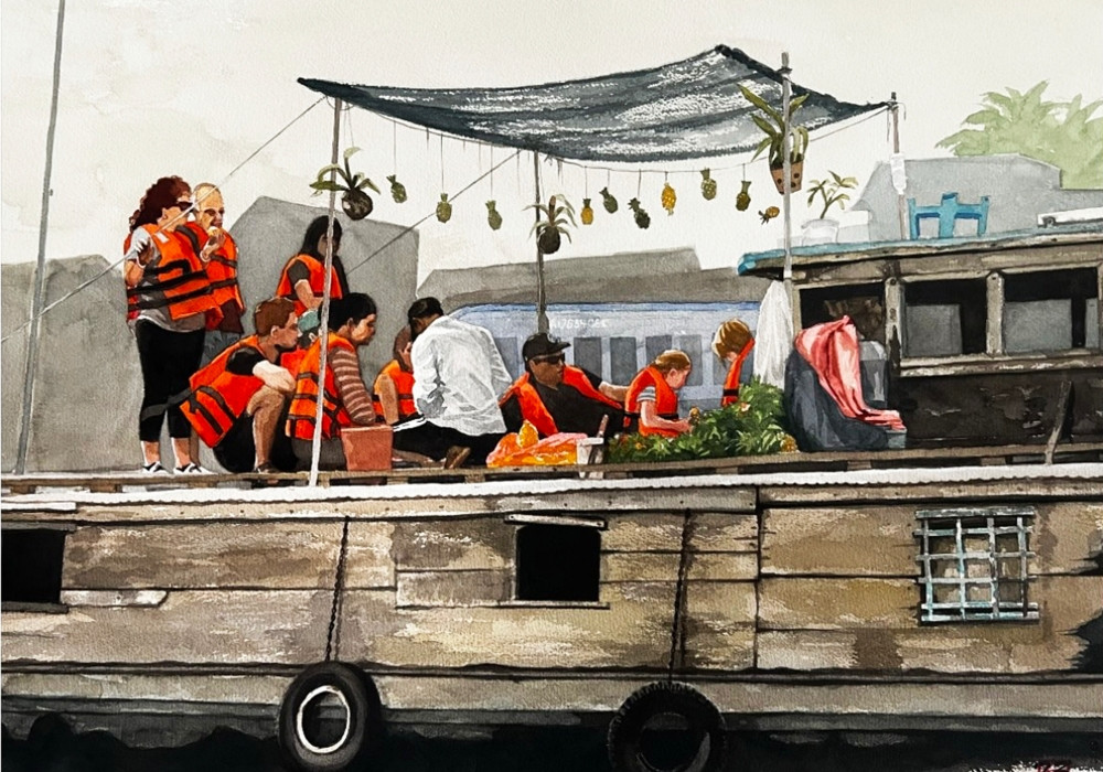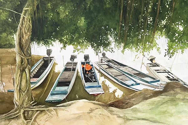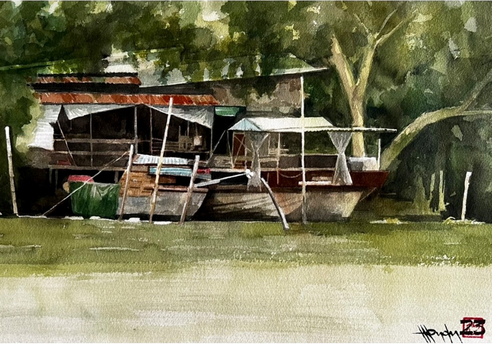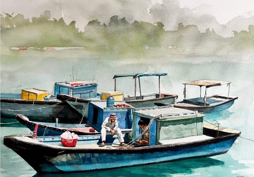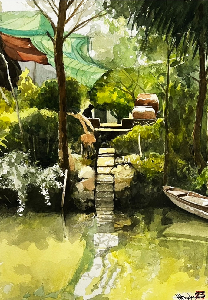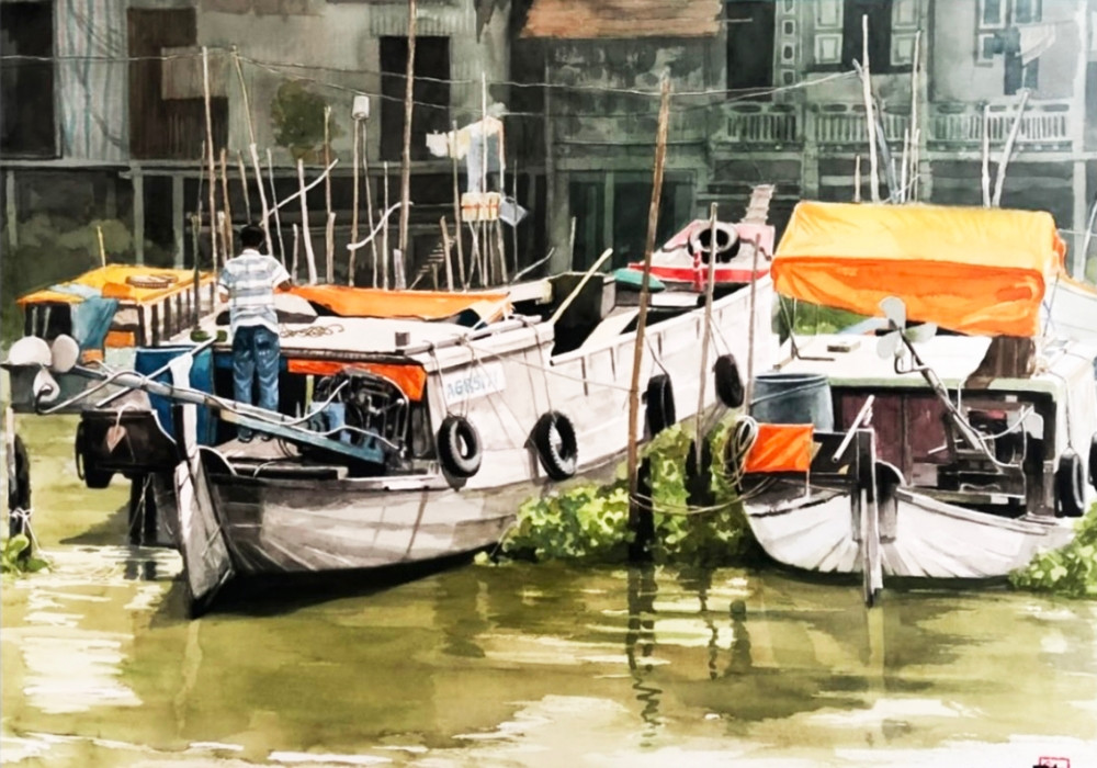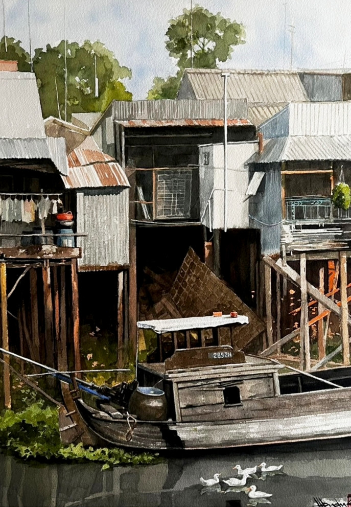 Cảnh chợ nổi, đoàn tàu neo bến, nhà sát bờ sông... được họa sĩ Hồng Quân khắc họa chân thực, thi vị qua những tác phẩm tranh màu nước.