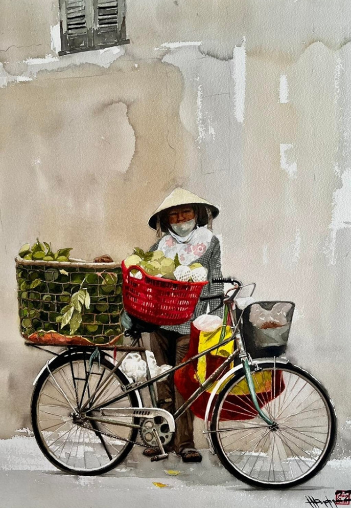 Bức 'Trưa vắng', họa sĩ Hồng Quân vẽ một người phụ nữ đi bán dạo, trên một con đường nhỏ, bên bức tường cũ... qua đó lột tả một câu chuyện đời. Đây là một trong hơn 50 bức tranh tại triển lãm màu nước lần thứ 4 của họa sĩ. Không gian sống của người dân miền sông nước được thể hiện qua bức 'Những ngôi nhà mái tôn'. Họa sĩ với bút pháp dày dặn, đặc tả tỉ mỉ từng khung cảnh như sắc non của hoa lá, độ trong của nước, sự hoen rỉ của sắt thép vì nhuốm màu thời gian…