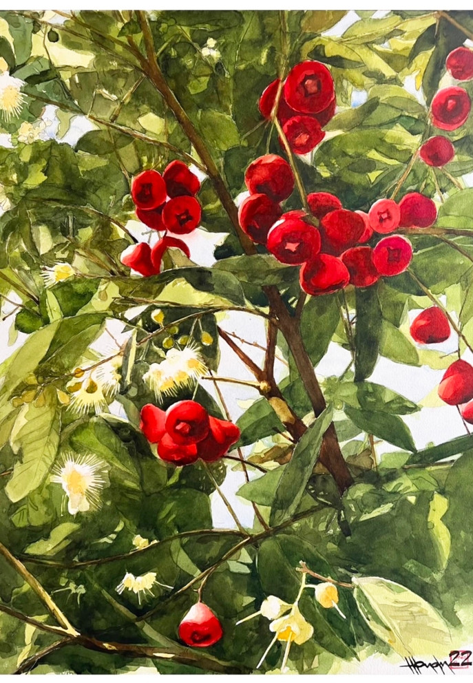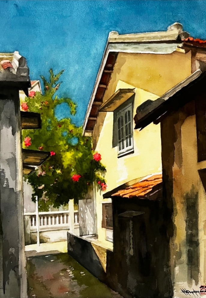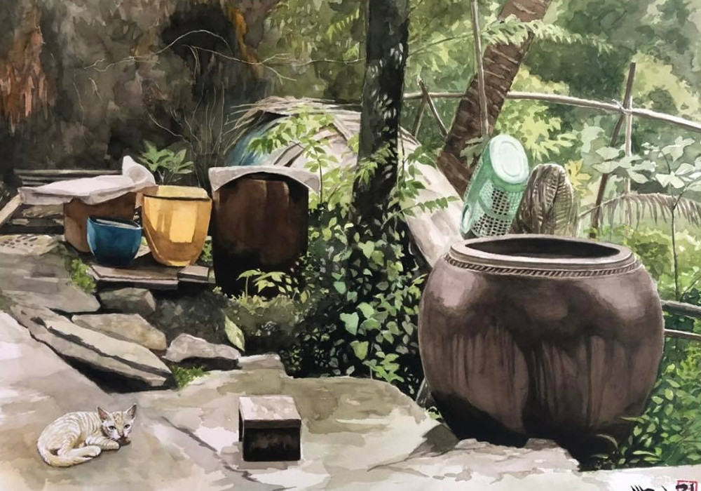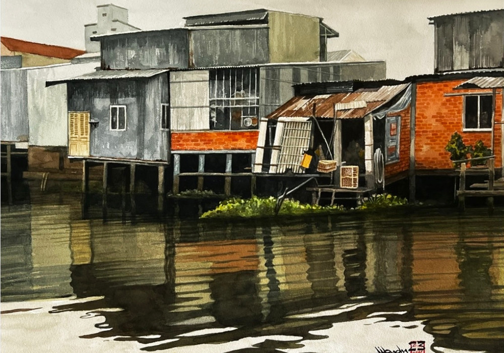 Bức 'Bên hông nhà' gợi nỗi nhớ quê với người con phương xa. Triển lãm 'Mùa nước' của họa sĩ Hồng Quân cũng là dịp giới thiệu không gian triển lãm mới mang tên Hawaii Art Space, kéo dài đến hết ngày 15/8 tại TP.HCM.