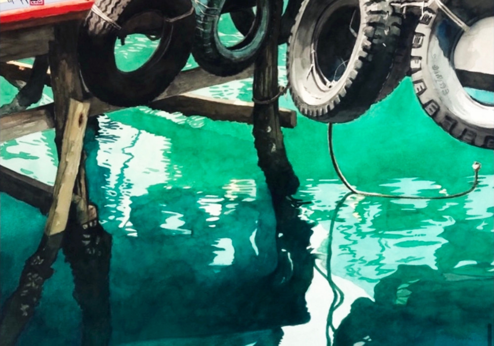 Cảnh sinh hoạt của ngư dân khi neo tàu ở bến qua bức 'Vùng biển xanh'. Vẻ đẹp trong tranh của Hồng Quân là sự hiền hòa và tinh tế. Phong cảnh, con người, sự vật hiện ra tĩnh tại, bình yên.