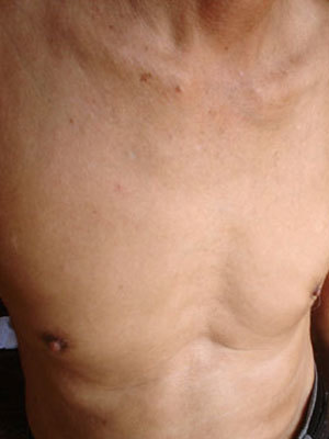 Ngực phải ông Kiểm bị lép do tên Tây đen húc đầu làm bẹp xương ngực, gãy xương sườn.