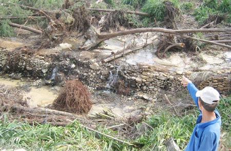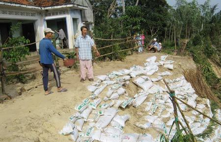 Sau khi sạt lở, người trong xóm hùn vốn mua hàng ngàn bao tải, đổ cát xếp ngăn không để nước “moi” sâu vào. Con đường độc đạo đi vào xóm Mới cạnh mép hố tử thần, mỗi khi trời mưa to, nước dưới dòng suối chảy mạnh xoáy vào, phía trên nước từ trổ máng của xóm nhà trút xuống ầm ào đổ dồn nước về hố sạt lở này.