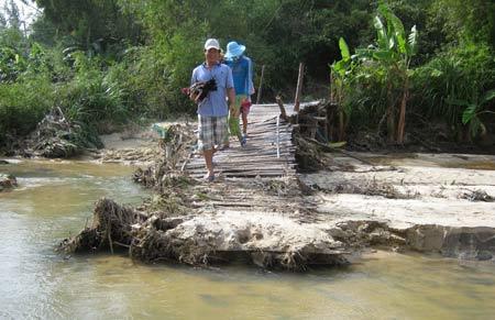 Con đường độc đạo vào Xóm Mới chỉ dành cho người đi bộ, vốn nhỏ hẹp nay lại bị lũ “treo”. Chiếc cầu tre bắc qua con mương nước bị lũ bẻ gãy, một đầu nằm gác trên bờ, một đầu chìm nghỉm dưới nước, phía bên kia sạt lở để lại mố đất dựng đứng, muốn vượt qua phải…bò.