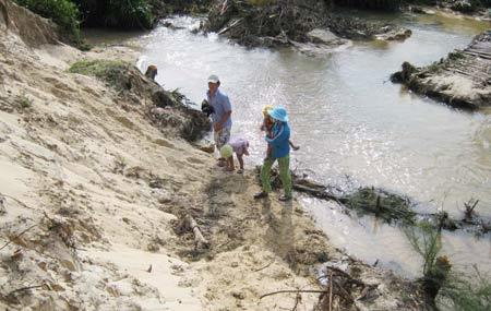 Ông Trung kể: “Mưa xối xả, nước từ hồ Đồng Môn xả lũ cộng với nước từ núi Hồng Qua, Động Tranh đổ dồn về đây như thác xoáy gây sạt lở. Chỉ trong một giờ đồng hồ nước cuốn hàng loạt bạch đàn, phi lao cao 10 - 15m ngã như sắn mì nhổ phơi, dừa bị tróc gốc. Chưa bao giờ tôi thấy dòng nước hung dữ thế này”. Năm nay ông Trung 73 tuổi, chứng kiến cảnh đó kể lại mà tim đập, chân run.