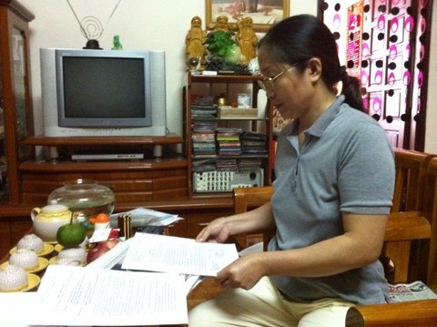 Cô Phó Thị Kim Anh, tổ phó khu dân cư với chồng đơn kiến nghị về chiếc thang máy