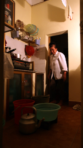 ![]() Bà Nữ (phòng 405) với lỉnh kỉnh xô, chậu đựng nước sinh hoạt vì điện và nước đã bị cắt. ![]() |