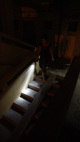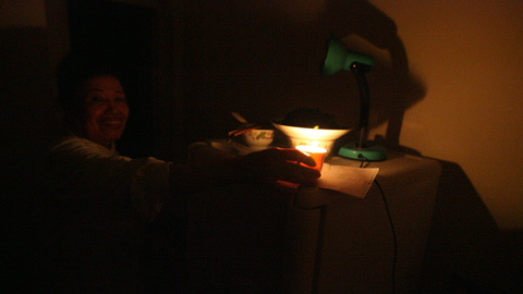 | Bà Quý (phòng 305) đang dọn dẹp trong ngôi nhà của mình dưới ánh đèn pin chiếu sáng. |