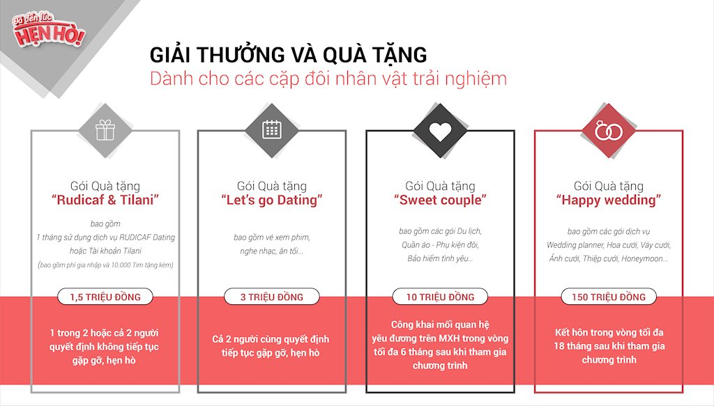 Đó cũng là lí do mà chương trình này được gọi là “Truyền hình thực tế” chứ không phải là Gameshow, và những người tham gia được gọi là “Nhân vật trải nghiệm” chứ không phải là “Người chơi”. Kết thúc mỗi chương trình, nếu như 2 Nhân vật trải nghiệm quyết định tiếp tục gặp gỡ sau buổi hẹn đầu này thì họ sẽ nhận được những phần quà thú vị phục vụ cho hành trình hẹn hò như: Vé xem phim, voucher hoa tươi, voucher ăn tối tại nhà hàng... Đặc biệt hơn, nếu như sau thời gian hẹn hò, họ thực sự đi đến tình yêu hay hôn nhân thì những phần thưởng sẽ càng giá trị hơn và có thể lên đến 150 triệu đồng, bao gồm các dịch vụ giải trí, du lịch, dịch vụ cưới, honeymoon...