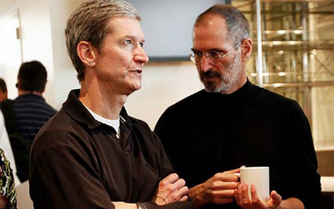 Tim Cook (trái) và Steve Jobs (phải).